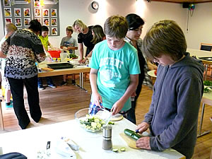 Am nächsten Tag, 20.6.2013, verwandelte Nicole Schreiber mit 11 Kindern und Eltern im „Cafe Fritzi“ des Frauenheims die geernteten Produkte zu leckeren Speisen. Beim Kochen wurde gleichzeitig über gesunde Ernährung und einfache Umsetzung im Alltag diskutiert. Zum Mit-nach-Hause-nehmen wurde Holunderblütengelee auf Apfelsaftgrundlage hergestellt.