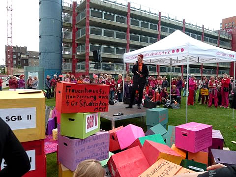 Frauenhäuser, Frauenberatungsstellen, Frauennotrufe und einzelne Verbände der freien Wohlfahrtspflege forderten am 11.September vor dem Düsseldorfer Landtag ein Landesfinanzierungsgesetz. Dieses war von der rot-grünen Landesregierung versprochen worden. Die Mitarbeiterinnen des Frauenhauses Soest waren an der Aktion beteiligt und führten ein Gespräch mit der Landtagsabgeordneten Marlies Stotz.