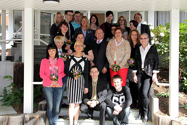 Nach ihrer bestandenen Abschlussprüfung nahmen Franziska Alscher, Ines Bakalla, Ann-Kathrin Behle, Regina Borowski, Tülay Bremser-Yilmaz, Nicole Bühner, Vera Kermann, Kevin Klose, Anna Kreft, Daniel Mertens, Elena Oltjan, Katharina Rensmann, Eileen Rottloff, Jenny Schulz, Pierre Sommerfeld, Carina Spiegel, Manuel Streich und Sylke Wahner die Zeugnisse und Glückwünsche entgegen.