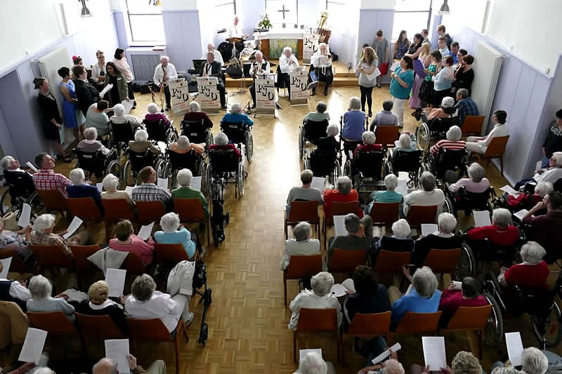 Das Paderborner Salonorchester und die Auszubildenden in der Altenpflege des Soester Fachseminares begleiteten eine Reise durch 5 Jahrzehnte durch Musik und Geschichten von 1950 bis 1990. Bewohnerinnen, Angehörige, Nachbarn und Interessierte kamen ins Soester Alten- und Pflegeheim. Kaffee und Kuchen, Grillwürste und Salate sorgten für beste Stimmung.