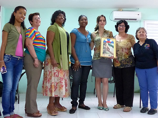 Ganz rechts die WGT-Vorsitzende Ormara Nolla, die Malerin mit dem Bild und Vertreterinnen des WGT aus Havanna.