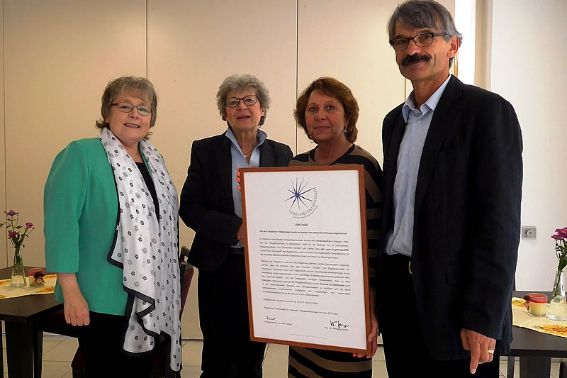 Hausleiterin Edna Künne, leitende Pfarrerin der Trägerin, Angelika Weigt-Blätgen, Pflegedienstleiterin Maria Schönberg im Gespräch mit Prof. Wolfgang George bei der Übergabe des Deutschen Palliativsiegels.