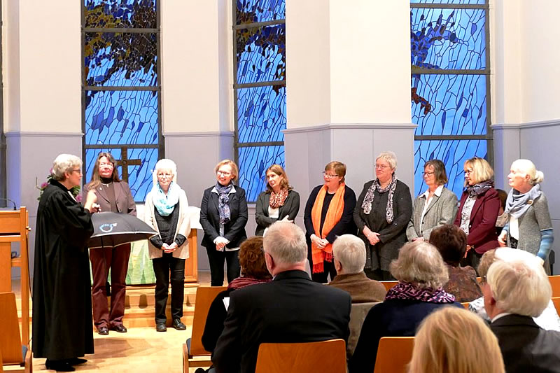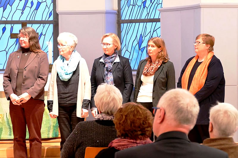 Helga Berghoff (Bochum), Pfarrerin Petra Buschmann-Simons (Bergkamen), Erika Denker (Siegen), Christiana Grimm (Werl) und Daniela Stiftel-Völker (Meschede) wurden in einem Gottesdienst der Evangelischen Frauenhilfe in Westfalen feierlich in ihre vier jährige Vorstands-Amtszeit am 7. November 2017 in Soest eingeführt. Barbara Mengel und Pfarrerin i.R. Renate Schleisiek wurden nach langjähriger Tätigkeit im Vorstand entpflichtet. Albert Henz war leider aus terminlichen Gründen verhindert. Mehr als 50 Gäste, teils Angehörige und Freunde der Vorstandsfrauen, teils Mitglieder des Verbandes, waren aus diesem Anlass gekommen.