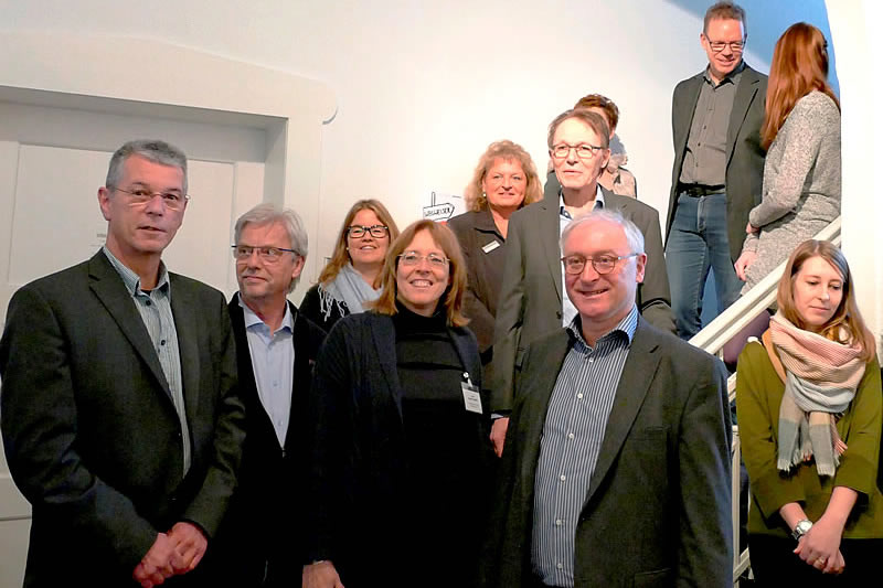 Geschäftsführer Dr. Reinhard Langer (Agentur für Arbeit Meschede-Soest, 2. von rechts), Schulleiter Paul Linnemann, (Fachseminar für Altenpflege der Evangelischen Frauenhilfe in Westfalen, oben rechts), Geschäftsführerin Ursula Rode-Schäffer (Regionalagentur Hellweg-Hochsauerland) und Michael Hammerschmidt (Jobcenter aha Kreis Soest), eröffneten die Gesundheits- und Pflegebörse im Fachseminar für Altenpflege in Soest.