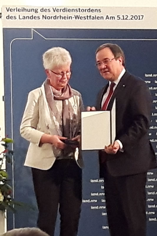 NRW-Ministerpräsident Armin Laschet hat am 05.12.2017 in Neuss die Krankenschwester Erika Denker aus Wilnsdorf und 17 weitere Bürger mit dem Verdienstorden des Landes ausgezeichnet. Sie erhielt den NRW-Landesorden, weil sie sich seit Jahren für Frauen in Not einsetzt.