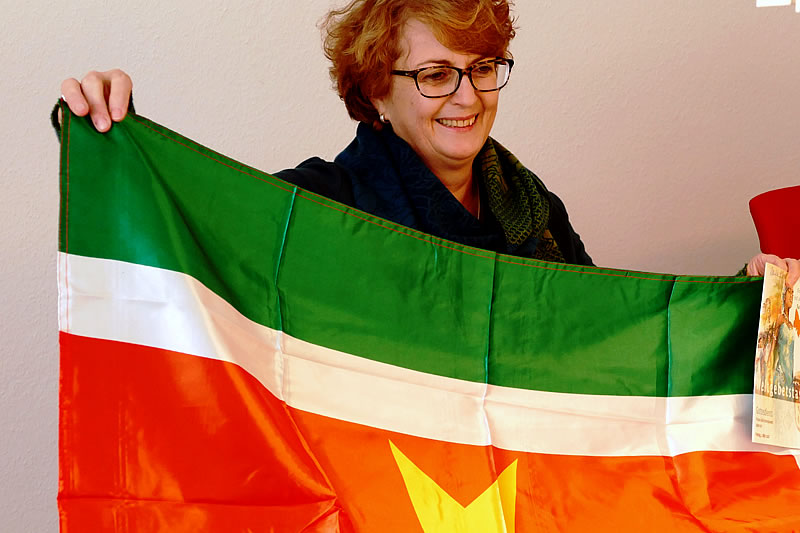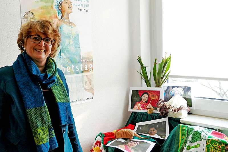 „Mindestens 1.000 Frauen erreichen wir von Oktober bis Februar und informieren über Land, Leute und Gebetsordnung“, erklärt Claudia Montanus und zeigt auf die Weltgebetstags-Liturgie surinamischer Christinnen mit dem Titel „Gottes Schöpfung ist sehr gut!“. Frauen bereiten sich in über 100 Ländern weltweit auf die Gottesdienste für den 2. März 2018 vor.