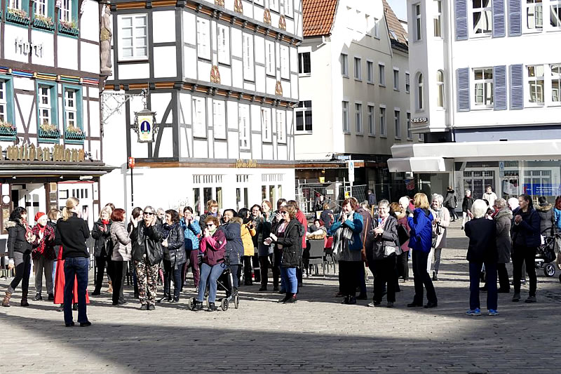 Zur gleichen Zeit fand auf dem Soester Marktplatz die Tanzaktion statt. Stefanie Feldmann, Inhaberin des Soester Ballettstudios, unterstützte die Aktion der "Kreiskooperationsrunde gegen Gewalt" mit Beteiligung des Frauenhauses Soest. Gemeinsam mit etwa 40 Interessierten führt sie den Tanz „Break the chain“ durch.
