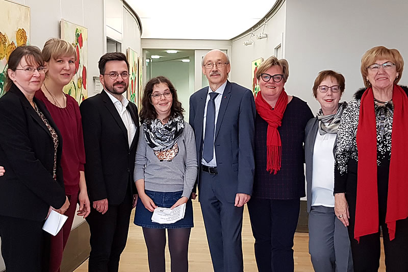 Kunsttherapeutin Joanna Skorupa, Künstlerin Christine Zeinhoff,  SPD-Fraktionsvorsitzender Thomas Kutschaty, Künstlerin Svenja Müller, Landtagsabgeordneter Professor Dr. Rainer Bovermann, Stellvertretende Bürgermeisterin der Stadt Wetter/Ruhr, Kirsten Stich, FRAUENHEIM-Leiterin Edelgard Spiegelberg und Elli Moormann von der AWO Wetter (v.l.) freuen sich über die gelungene Vernissage.