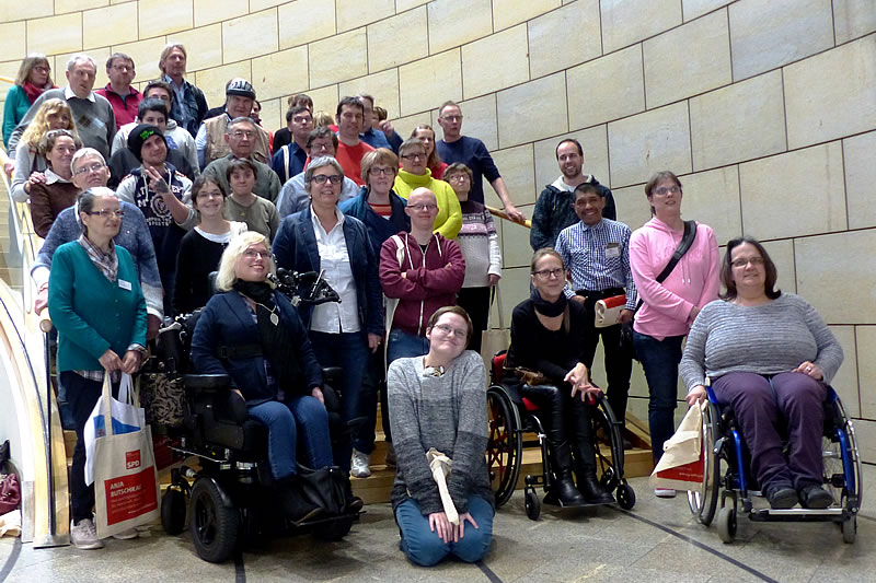 Organisiert wurde der Besuch am 12.02.2019 durch das Kompetenzzentrum Selbstbestimmtes Leben (KSL) Regierungsbezirk Arnsberg. Zunächst fanden sich nach entspannter Busanreise aus Wengern alle beteiligten Gruppen im Foyer des Landtags zusammen. Dazu gehörte - neben dem KSL auch der KÜNSTLERstammtisch ChiccoART aus Dortmund, EUTB – Teilhabeberatung selbstbestimmt leben Dortmund, der Caritas Arnsberg Sundern und zwei selbstständig mitgereisten Frauen - auch eine große Gruppe des FRAUENHEIM WENGERN. Aus dem Frauenheim reisten mehrere Gremien mit: Der Beirat der Bewohner*innen, der Werkstattrat, die Frauenbeauftragung von Werkstatt und Wohnheim und der Arbeitskreis Politische Bildung.