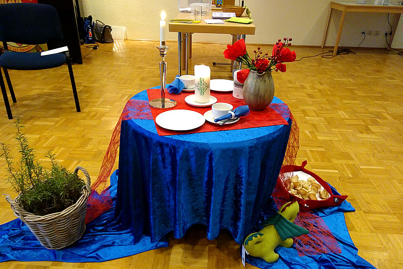 Auch ernste Töne waren zu hören: In der Bibelarbeit, die das Gastmahl aus Lukas 14 zum Inhalt hat, wurde intensiv und selbstkritisch diskutiert: Wer nimmt an unseren Festen teil? Wir kann es durch unser Mittun gelingen, dass jede einen Platz am Tisch der Erde hat? Wie können wir gastfreundliches Land, gastfreundliche Stadt und Kirche werden? „Ganz ehrlich“, meinte Sylvia aus Arnsberg nachdenklich: „ich finde es gar nicht so leicht, mit Fremden umzugehen…“ Frederike aus Minden erwidert: „Dann versuch‘s doch einfach mal. Jesus hat genau das moniert: dass alle unter sich bleiben und die, die auch Hunger haben an Leib und Seele, außen vor bleiben.“