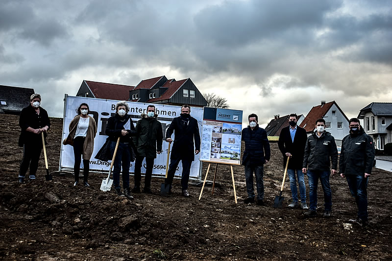 Trotz der Pandemiezeit konnten Christiane Vößing, Nathalie Kuhaupt, Angelika Weigt-Blätgen, Ralf Klipsch, Frank Iggesen, Werner Niggemeier, Architekt Philipp Niggemeier und zwei Mitarbeiter der Baufirma Dinger die Grundsteinlegung für den Ersatzneubau Haus Phöbe vollziehen. (Foto EFhiW)