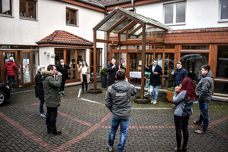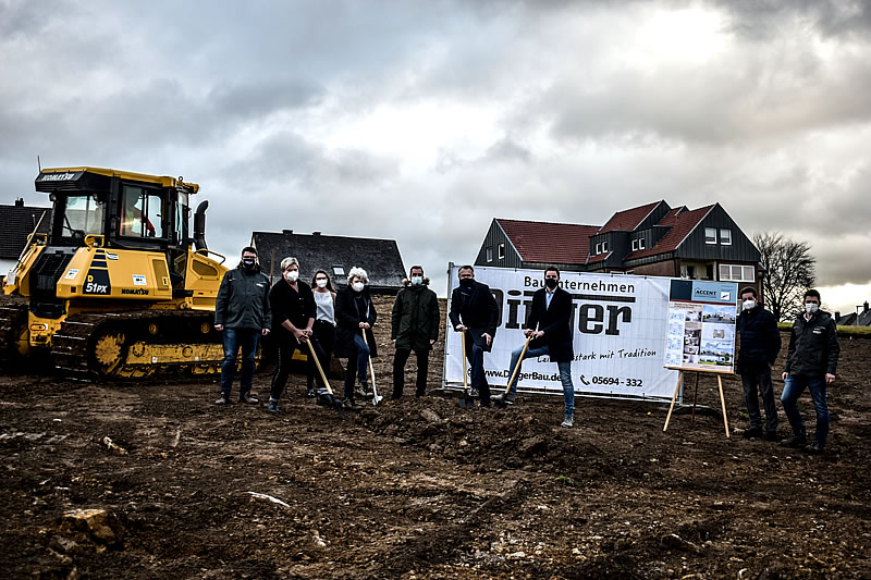 Pfarrerin Angelika Weigt-Blätgen und Ralf Klipsch von der Evangelischen Frauenhilfe in Westfalen, Hausleiterin Christiane Vößing und Pflegedienstleiterin Nathalie Kuhaupt vom Alten- und Pflegeheim Haus Phöbe, Architekt Philipp Niggemeier und Werner Niggemeier, Geschäftsleitung der Accent GmbH in Salzkotten, und Frank Iggesen von Scholz & Partner GmbH in Salzkotten haben den Grundstein für den Ersatzneubau eines Alten- und Pflegeheimes in Scherfede-Rimbeck am 22. Dezember gelegt. Nur ein kleiner Kreis konnte dem kleinen Ritual beiwohnen.