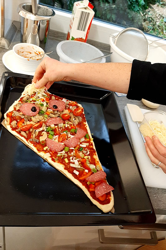 Zum stilvollen Dekorieren der Tische standen Körbe mit herbstlichen Bastelutensilien für jede Familie bereit. Die Kinder verwandelten diese sofort begeistert in Drachen und ließen ihrer Fantasie beim Herrichten der Esstische freien Lauf. „Genauso bunt wie unser Tisch ist auch meine Drachenpizza geworden!“ stellt die achtjährige Lena stolz fest.