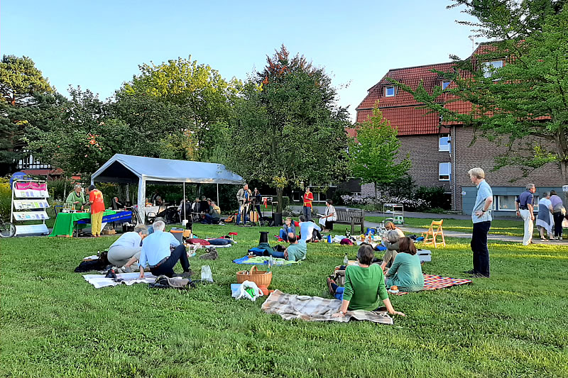 Am ersten Freitag im September von 17 bis ca. 20:30 Uhr gesellten sich etwa 40 Frauen, Männer und Familien ein. Auf bunten Decken oder auf Stühlen ließen sich die teilweise in grün Gekleideten mit ihren mitgebrachten Picknick-Essen nieder. Das Wetter war bestens, so dass der Barfußpfad auf dem Gelände gern und häufig ausprobiert wurde. Birnen, Pflaumen, Mirabellen und Beeren der Obstbäume und -Sträucher versüßten so manch herzhafte Speise. Quittensaft und Fruchtaufstrich aus dem eigenen Biolandbetrieb in Wetter-Wengern konnten am Stand der Westfälischen Frauenhilfe erworben und gleich probiert werden.
