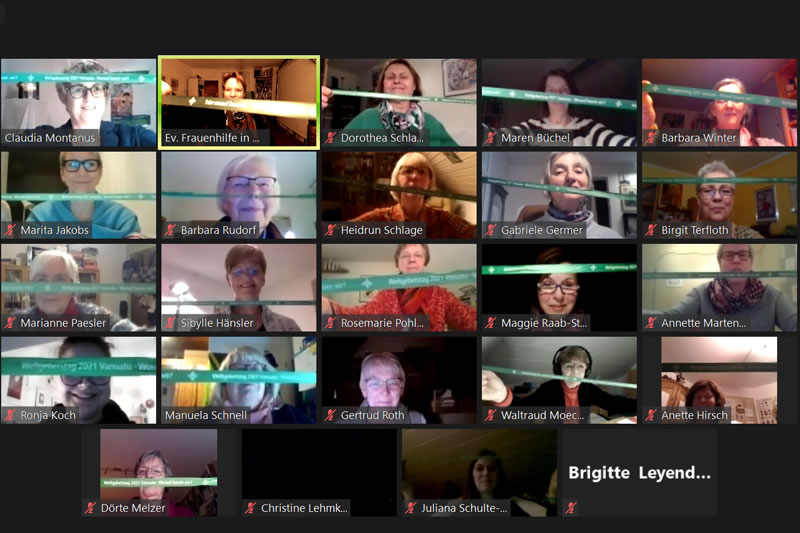 Mit Staunen, Spaß und Wissbegierde waren die Teilnehmenden dabei. Frauen des westfälischen ökumenischen WGT-Teams und Koordinatorin Claudia Montanus leiteten die Teilnehmerinnen mit kreativen Methoden an. Die ein oder andere Panne beim Videotreffen wurde von Verbandsreferentin Christina Vetter geduldig behoben. In der digitalen Bibliothek genossen die Teilnehmerinnen über vier Wochen hinweg die reichhaltige Auswahl an Audios, Videos, Referaten und Deko- sowie Bastelvorschlägen. Beim Abschiedstreffen hoben die Frauen nach dem Segen Smileykärtchen in die Kamera.