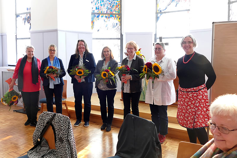 Vorsitzende Angelika Waldheuer (v.l.) gratulierte Heike Henrichs-Neuser, Christiana Grimm, Pfarrerin Petra Buschmann-Simons, Studienrätin Daniela Stiftel-Völker und Dorothe Müller gemeinsam mit Pfarrerin Birgit Reiche zur Wahl. Auf dem Foto fehlen Helga Berghoff und die neue stellvertretende Vorsitzende, Dr. Beate von Miquel.