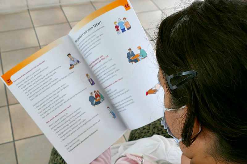 Die Frauengruppe Mutig und Stark hat zusammen mit der Frauenberatung im EN-Kreis gesine intervention den Text des Leitfadens erstellt. Er wurde vom ‚Büro für leichte Sprache Volmarstein‘ in leichte Sprache übersetzt. Dadurch gibt es viele einfache kurze Sätze und viele Erklär-Bilder. Anschließend wurde alles noch einmal - u.a. von der Frauengruppe - auf Verständlichkeit hin überprüft. „Im Sommer 2019 war er schon fertig. Jetzt konnten wir ihn endlich einführen. – Überlegen, den Text Erarbeiten, Gegenlesen - ist im Nachhinein einfach gewesen. In diesem Jahr haben wir geübt, den Inhalt anderen Frauen zu erklären. Das ist aufregend, das ist anstrengend. – Aber wir haben es geschafft“, lautet das Fazit zum Prozess von den Frauen.