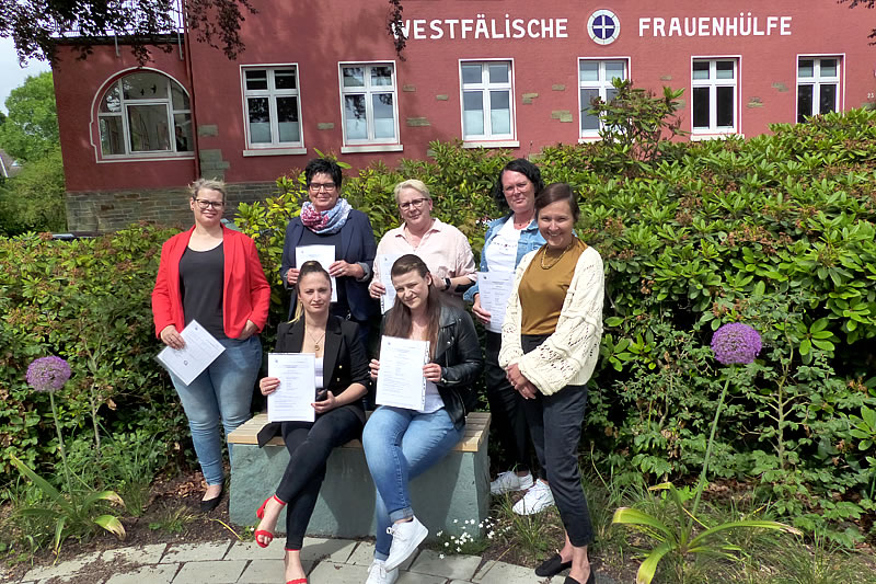 Mimoza Lusha und Andrea Komke vom Pflegedienst lebenswert in Ense, Petra Leseberg-Lobenstein vom St. Ida Stift in Lippetal, Jennifer Pistol von der Thomä-Residenz in Soest, Jasmin Zellner, vom Hanse-Zentrum in Soest und Vanessa Normann von PROVITA in Ense hatten sich im Herbst 2021 auf neun Blöcke Weiterbildung eingelassen, die nun Mitte Juni einen erfolgreichen Abschluss fanden. Ihre Qualifikation ist mit der Ausbildereignung in anderen dualen Ausbildungen vergleichbar.