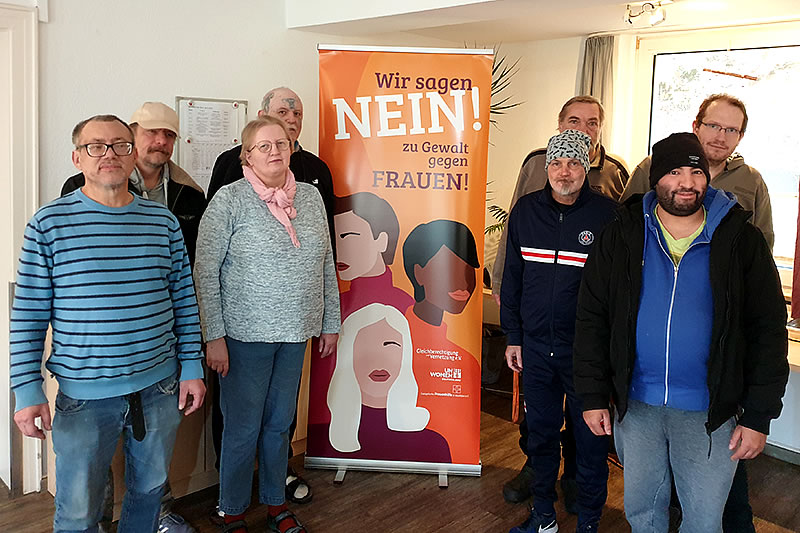 Bewohnerinnen und Bewohner von Haus WegWende sagen: NEIN zu Gewalt an Frauen! Haus WegWende in Werdohl ist ein Angebot für erwachsene Menschen mit einer psychischen Behinderung, die vorübergehend oder langfristig einen stationären Hilfebedarf haben. Die Bewohner*innen und Mitarbeitenden zeigen Gesicht und sagen gemeinsam, dass Gewalt gegen Frauen beendet werden muss.