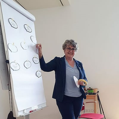 Neben Zeichen-, Körper- und Fremdsprache ging Claudia Montanus auf eine weitere ein: sie übte vor dem Mittagessen mit den Teilnehmerinnen die Gebetszeile „Vater unser im Himmel, unter tägliches Brot gib uns heute" in Gebärdensprache. Auch die Mimik als Teil von Sprache wurde eingehend untersucht. Fotos mit Menschen, die mit ihrem Gesichtsausdruck unterschiedliche Gefühle ausdrücken, wurden unter die Lupe genommen und es zeigte sich, dass jede Person die Mimik durchaus differenziert sehen kann.