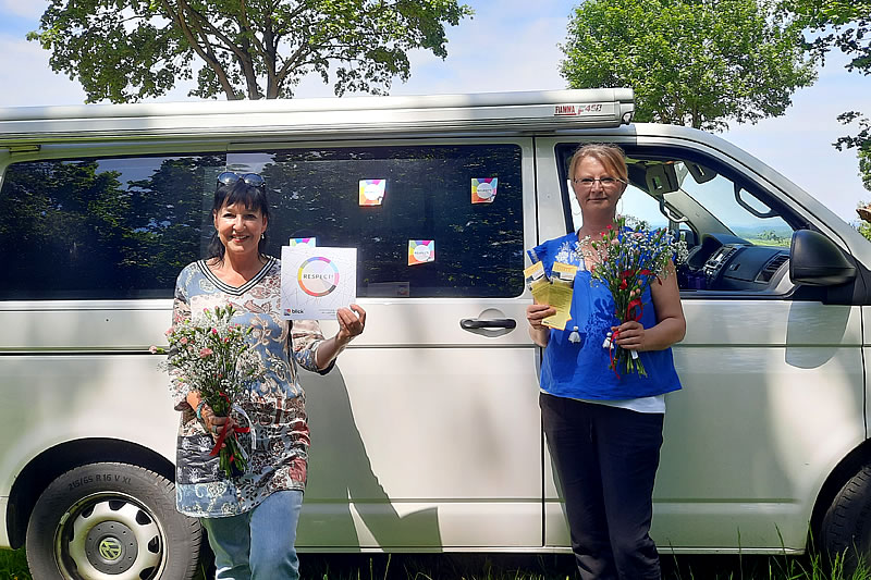 Den Welthurentag nahmen sie auch zum Anlass, der Respect!-Kampagne sichtbar beizutreten. Der Aufkleber der „Respect!-Kampagne“ ist an den Fenstern des Beratungsbusses von TAMAR sichtbar angebracht. „Alle Menschen sind respektvoll zu behandeln. Menschen aus der LSBTIQ*-Community erleben das häufig nicht so“, so Birgit Reiche, Leiterin der Beratungsstelle und Leitende Pfarrerin der Evangelischen Frauenhilfe in Westfalen (EFHiW). Ziel der Respect!-Kampagne ist es, Menschen der LSBTIQ* Communities sowie deren Angehörige an lokale Unterstützungsangebote zu verweisen und ihnen auch überregionale Informationen und Anlaufstellen zugänglich zu machen.