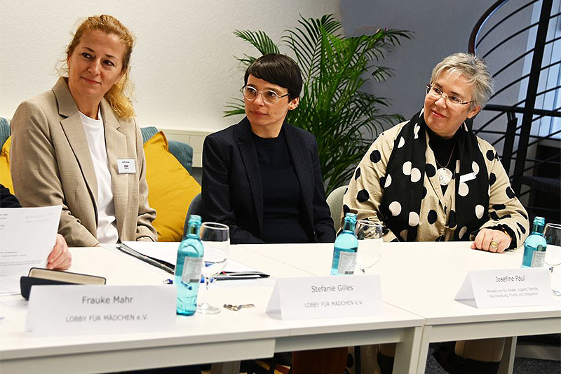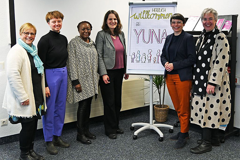 Die Mitarbeiterinnen der Fachstellen YUNA NRW freuen sich über Zusage von Ministerin Josefine Paul (4.v.r.), flächendeckende Beratungs- und Präventionsangebote zu fördern.