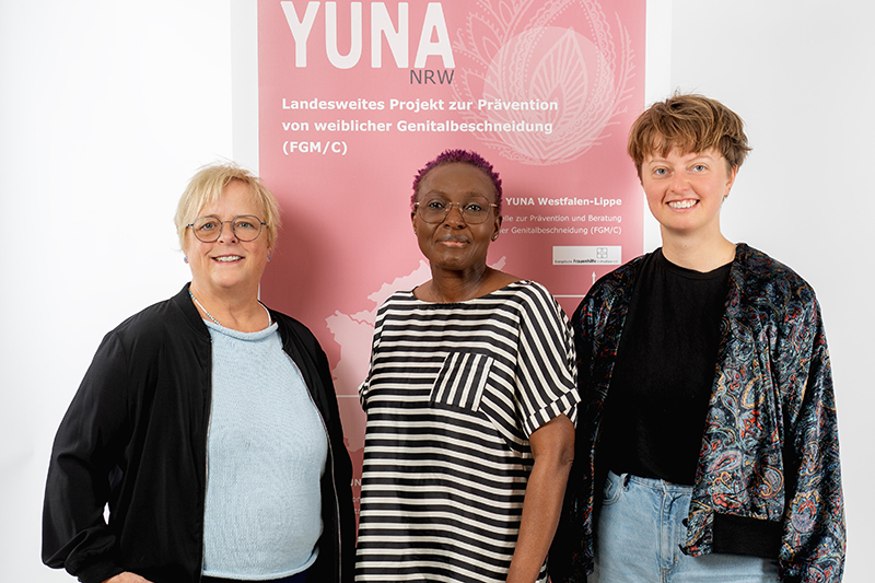 Seit November 2023 setzt sich die Fachstelle YUNA Westfalen-Lippe mit ihrer Trägerin, der Evangelischen Frauenhilfe in Westfalen e.V., für die Prävention und Beratung bei FGM/C ein. Das dreiköpfige Team unterstützt betroffene und bedrohte Mädchen und Frauen – dabei geht es nicht nur um akute Bedrohungssituationen, sondern auch um langfristige Begleitung, medizinische Beratung und rechtliche Unterstützung. „Uns ist wichtig, FGM/C als ein Teil der Gesamtbiografie der Frauen und Mädchen zu betrachten“, stellt Mitarbeiterin Anna Douti-Lauter klar.